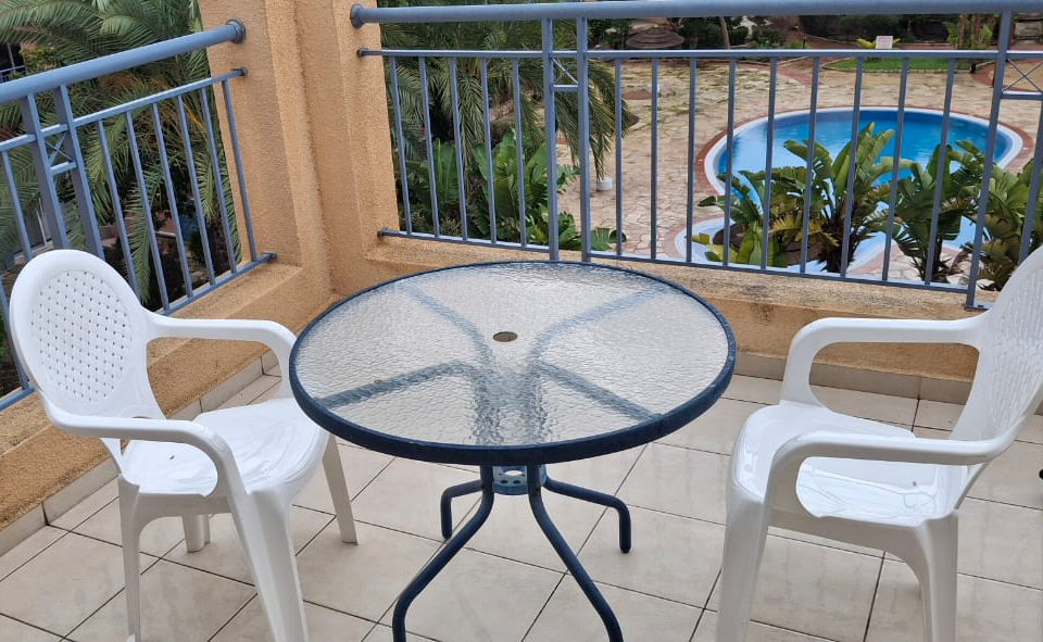 Balcony - Large, south-facing, pool-facing, 2 chairs and table, is ideal for private sunbathing and watching the sunset.
